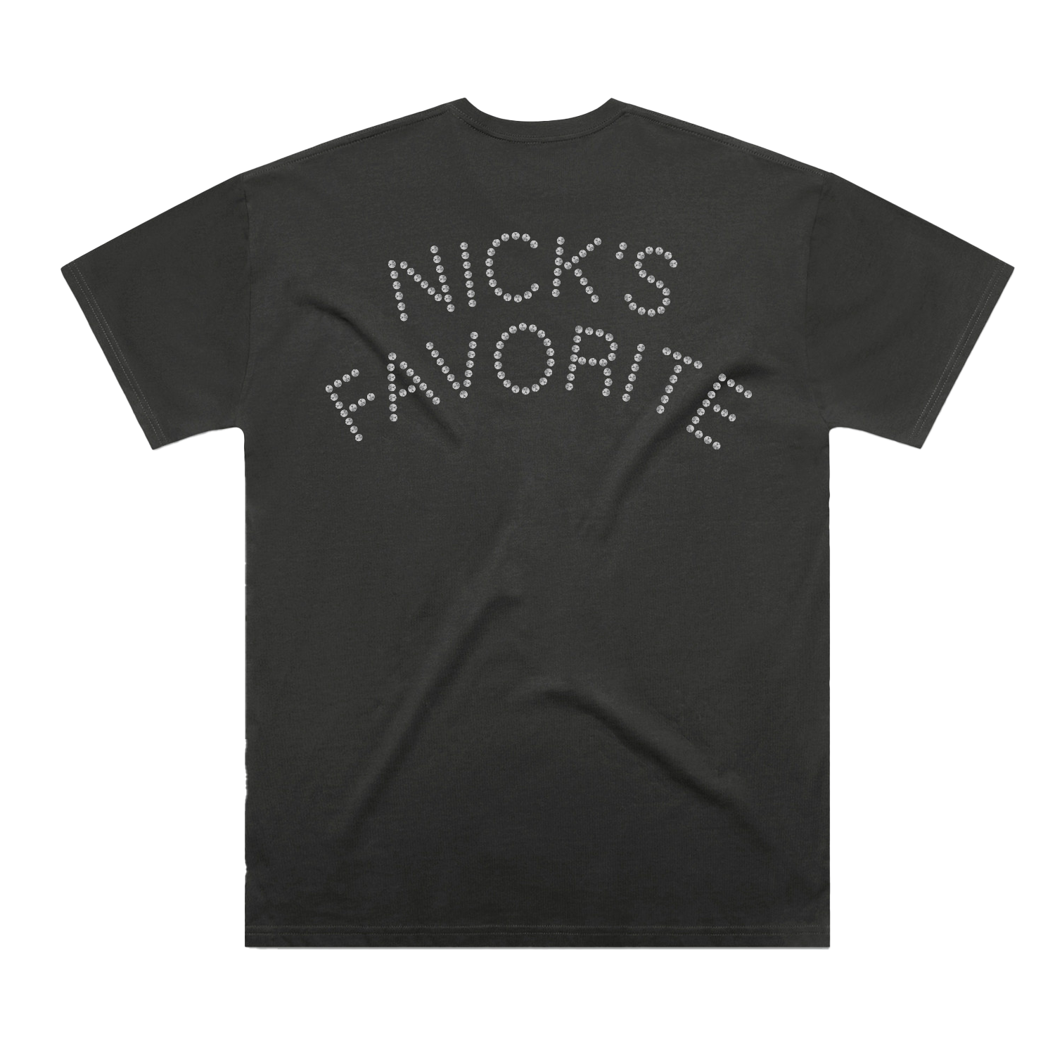 The Nick's Favorite Tee is a special launch related to the Greetings From Your Hometown 2025 Tour! This tee is in the color coal and made of 100% cotton. ONLY AVAILABLE ONLINE!