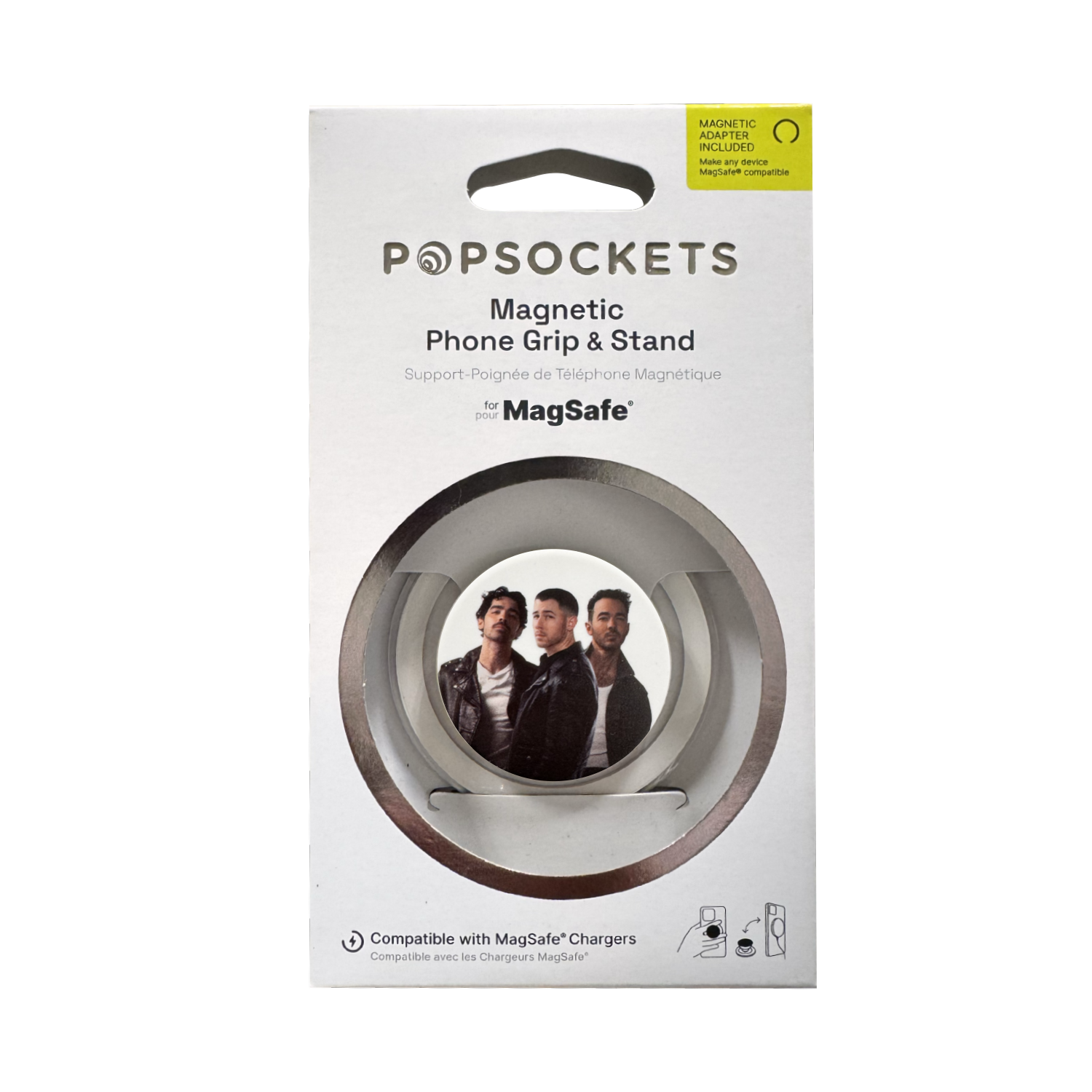 Jonas Brothers featured on a pop-socket with a magnetic phone grip and stand. Compatible with MagSafe chargers.