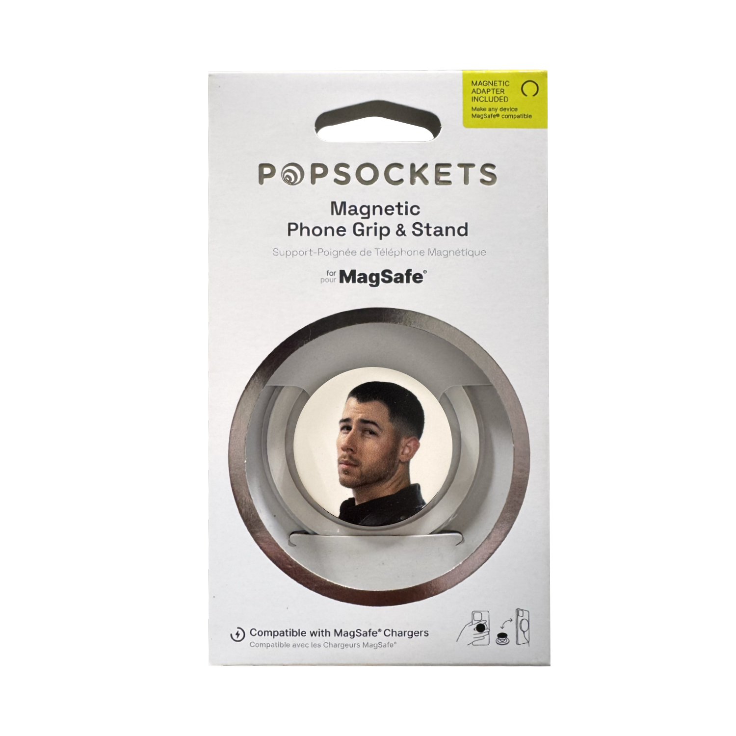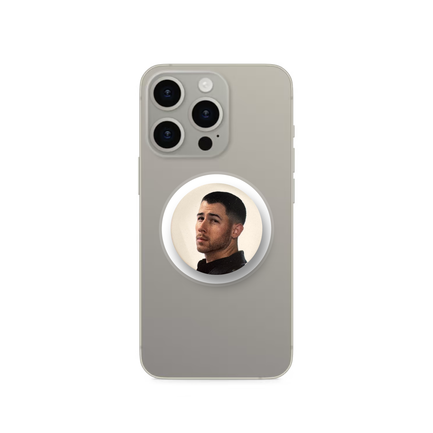 Nick Jonas featured on a pop-socket with a magnetic phone grip and stand. Compatible with MagSafe chargers.